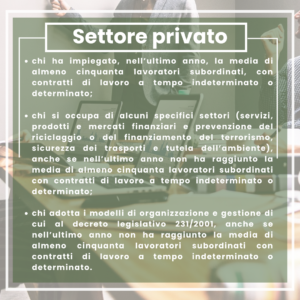 A far data dal 17 dicembre 2023, tutte le aziende del settore privato che hanno impiegato in media almeno 50 dipendenti o che adottano un modello organizzativo gestionale ai sensi del D.Lgs 231/2001, indipendentemente dal numero di addetti, dovranno implementare tale sistema.